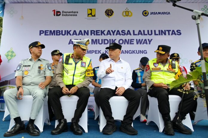 Menteri Perhubungan (Menhub) Dudy Purwagandhi bersama Kapolda Jawa Barat (Jabar) Irjen. Pol. Rudi resmi memberlakukan rekayasa lalu lintas one way nasional di Tol Cikampek Utama KM 70, pada Rabu (18/3/2026) siang.